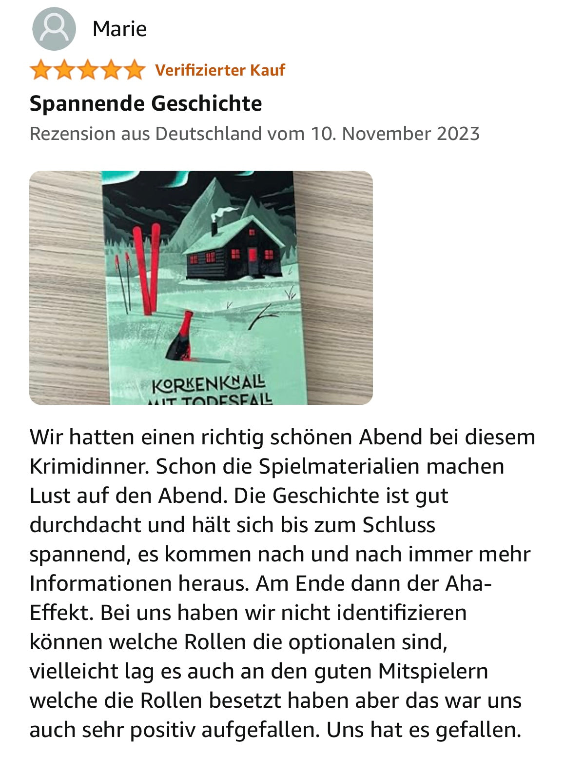 Vielen Dank für das tolle Krimidinner Spiel! Wir haben es am Wochenende hier zu fünft in den Schweizer Bergen in einer Hütte gespielt und hatten viel Spass dabei.