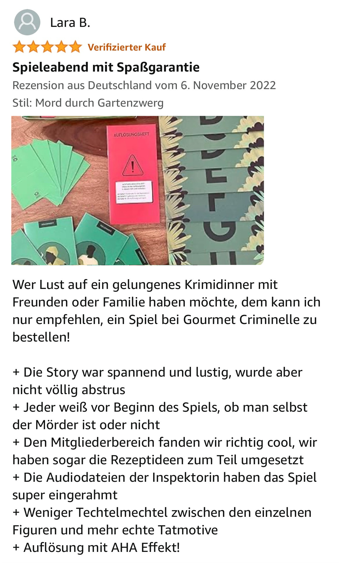 Die Krimidinner von Gourmet Criminelle sind ein Highlight auf unseren Spiele-Abenden! Jedes Spiel überzeugte uns mit seinem individuellen Thema und abwechslungsreichen Geschichten, die bis zum Schluss spannend blieben – immer garniert mit einer ordentlichen Prise Humor.
