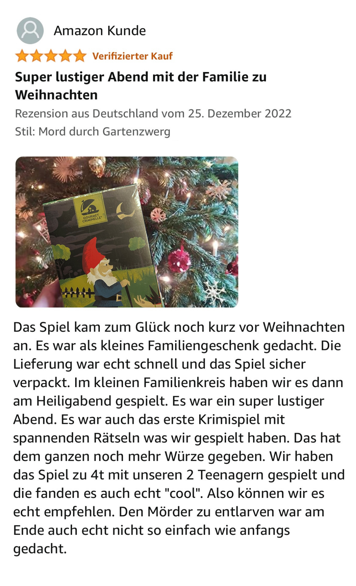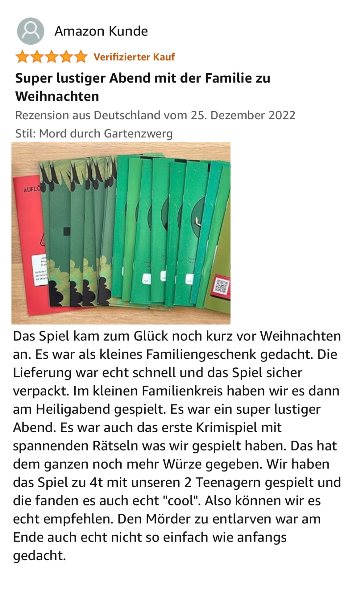Mal in andere Rollen schlüpfen, sich cool verkleiden und dabei noch einen Mordfall lösen. Spiel, Spaß und Spannung. Mit diesem Spiel habt ihr bei uns genau ins Schwarze getroffen. Der Abend verging wie im Flug. Selten so gelacht und Spaß gehabt.