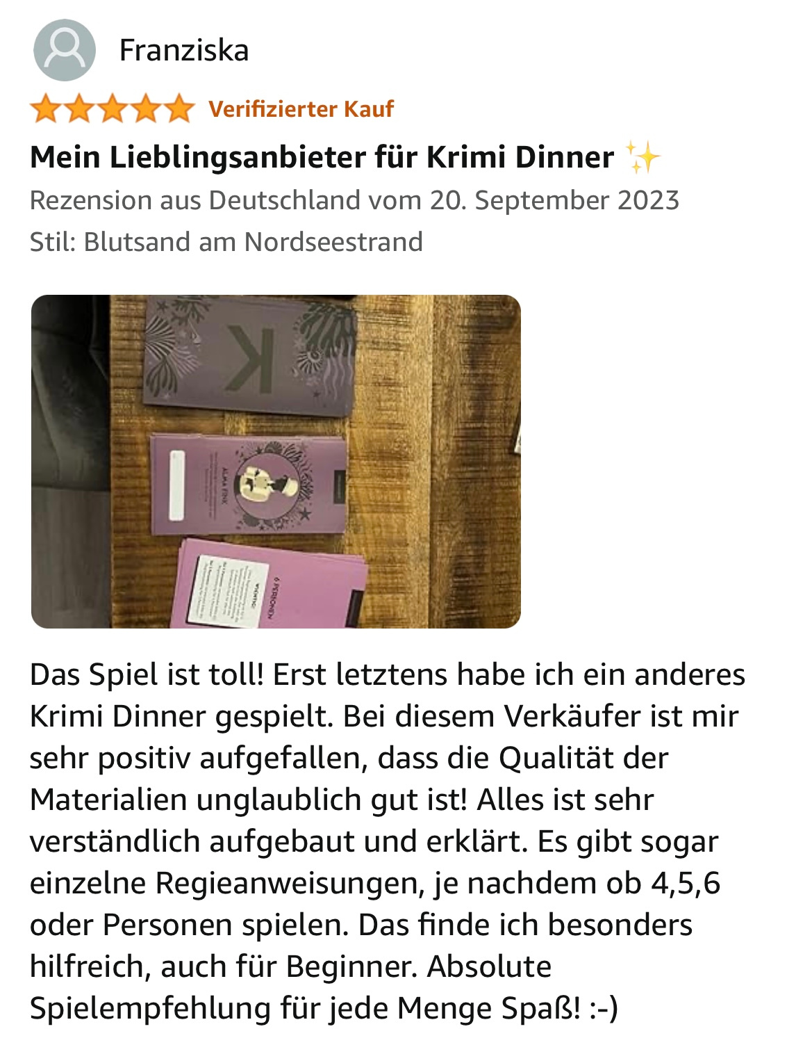 Vielen Dank für das tolle Krimidinner Spiel! Wir haben es am Wochenende hier zu fünft in den Schweizer Bergen in einer Hütte gespielt und hatten viel Spass dabei.
