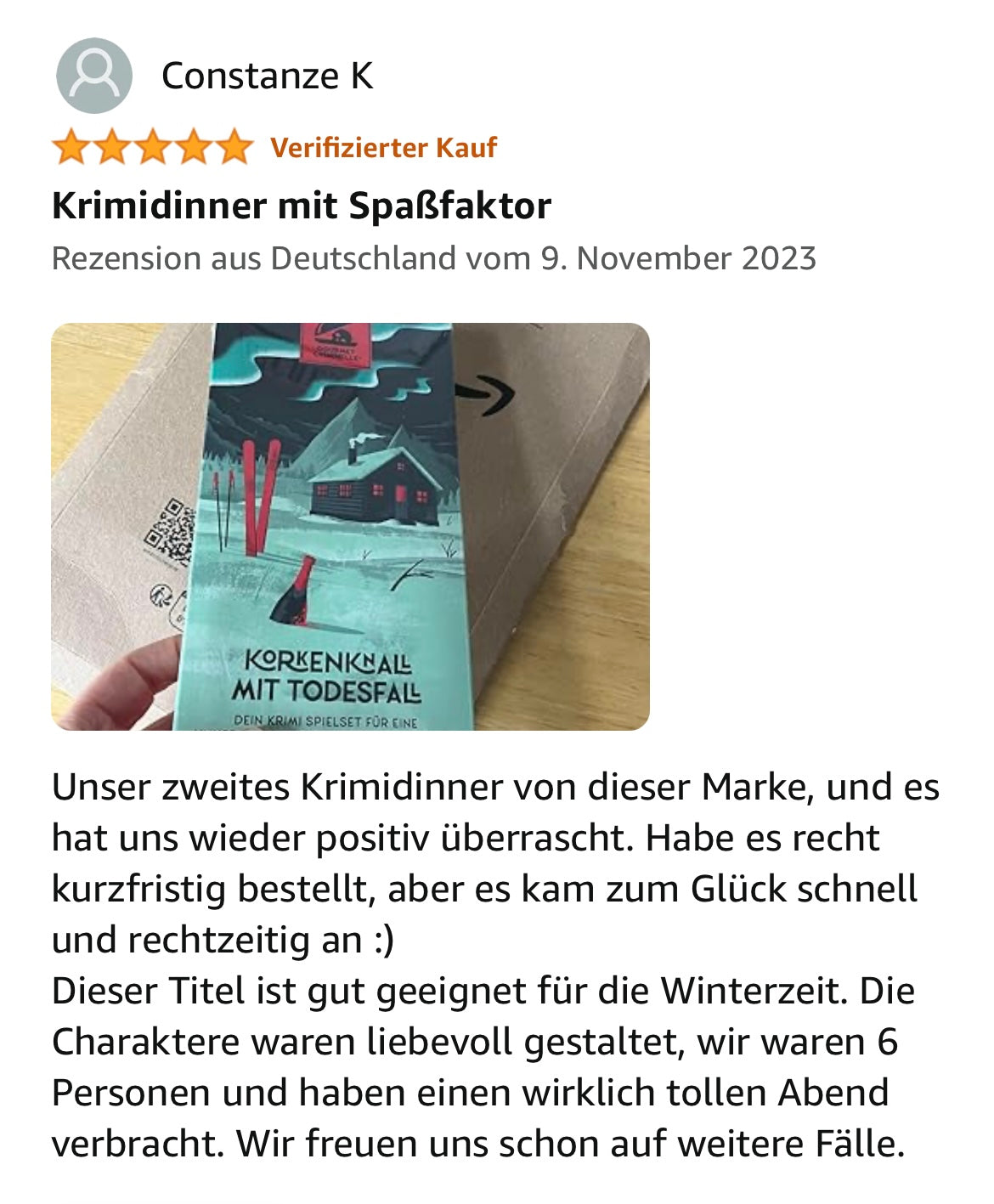 „Der perfekte Mix aus Kriminalfall und Rätsel. Und – was uns sehr wichtig ist – alles logisch herleitbar. Durch die detaillierte Beschreibung konnten wir in die Schneewelt Norwegens eintauchen. Alles was ein gutes Krimidinner benötigt um einen gelungenen Abend zu garantieren.“