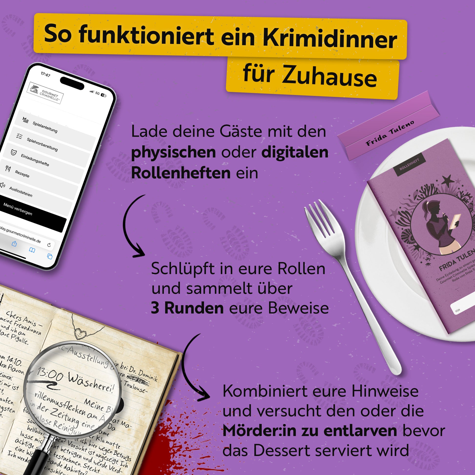 Um ein Krimi-Spiel von Gourmet Criminelle zu spielen, muss man kein Schauspieltalent sein! Im Gegenteil. Durch die Empfehlungen und Anregungen in den Rollenheften können alle Mitspielenden ganz leicht in ihre Rollen schlüpfen. Dabei entscheidet jeder für sich, wie er oder sie ihre Rolle mit Leben füllen möchte.