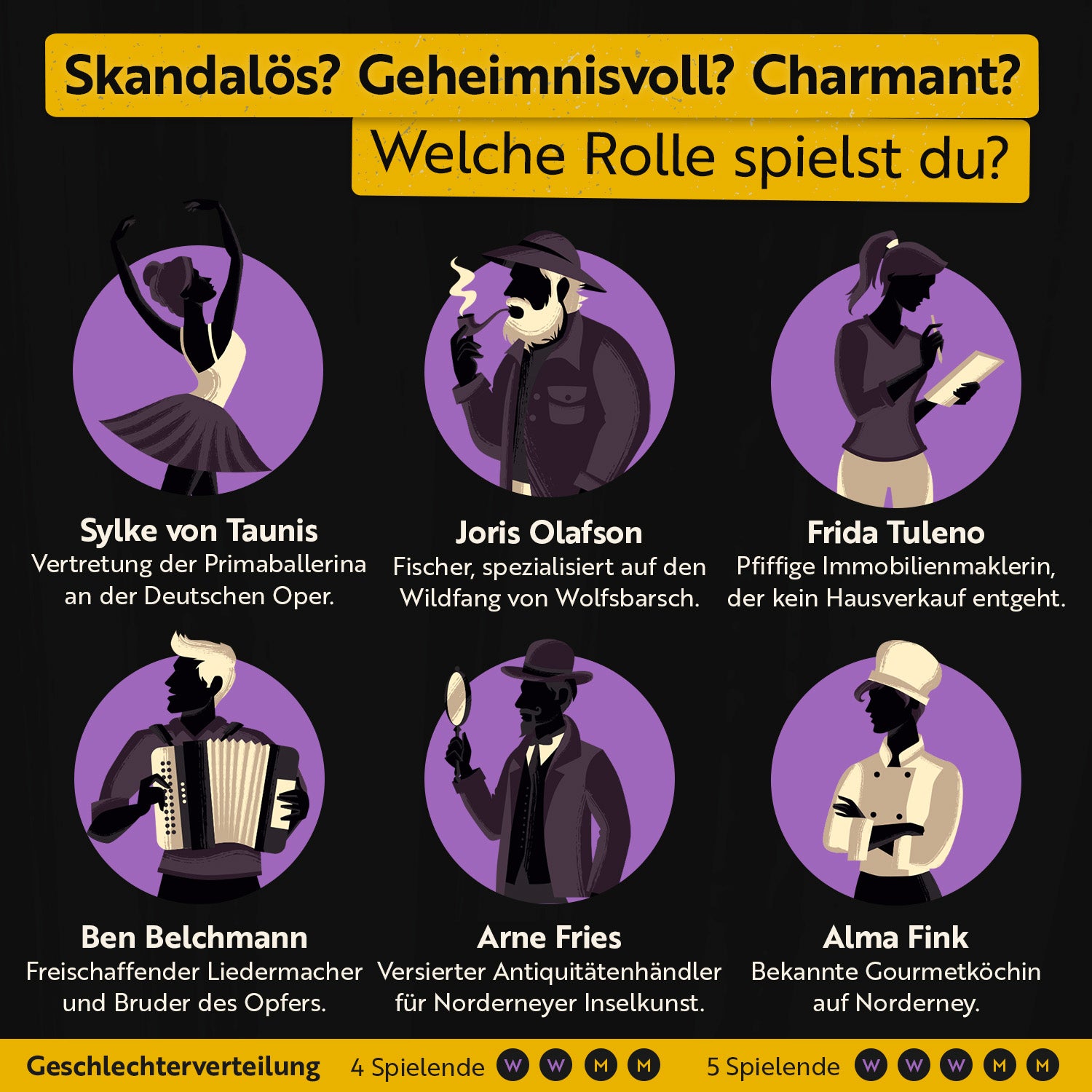 Die Rollen sind liebevoll ausgearbeitet, inklusive passender Kleidungsvorschläge. Besonders praktisch: Auch Menütipps für das Dinner werden gleich mitgeliefert. Die kleinen Rätsel, die in die Geschichten eingebaut sind, machen diese Krimispiele einzigartig und sorgen für jede Menge Unterhaltung.